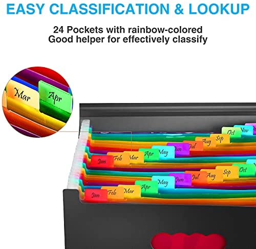 • Handy organization & Easy lookup: Expandable file folder has 24 pockets designed for keeping our paperwork organized. Accurately classified storage in the specific colour slot and labelled with tabs, so it is easier to find the papers what is needed.